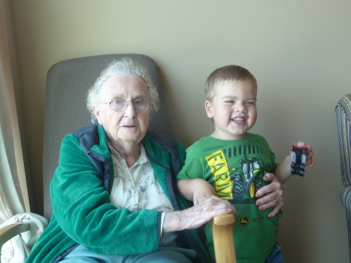 Playing by Great-grandma Muriel.