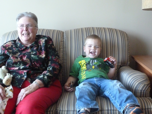Sunday morning I watched cartoons with Grandpa Al and Grandma Wynne. After lunch we went visiting, first to see Great-grandma Dorothy in her tower. Auntie Diane and Uncle Bill were there as well.