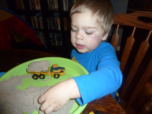 On Monday and Tuesday, Daddy and I played with LEGO and with cups and sand - and I jumped out of my tent, tripped, and gave myself a black eye by smashing my face into my play kitchen in my room. Ouch! It's getting better, though. Monday was also Daddy's birthday, so Mommy and I made him blueberry muffins as a treat.