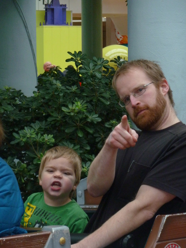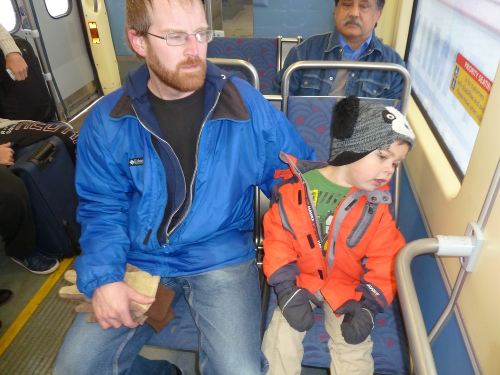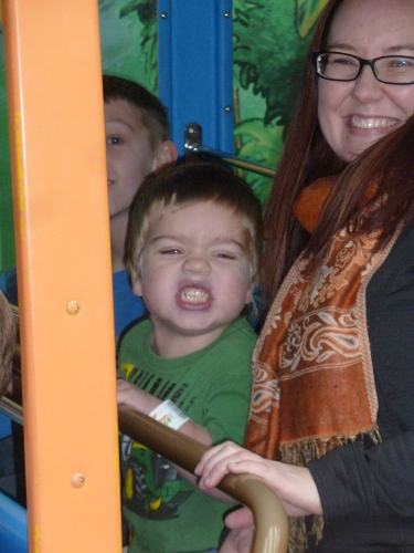 On the bus. Mommy is just pretending to be excited. (She doesn't like the bus ride.)
