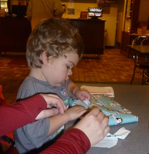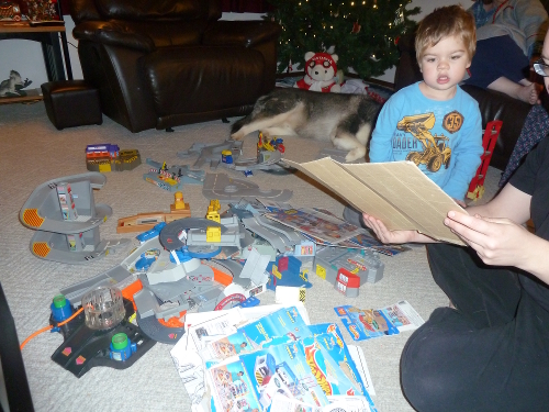 On Thursday we went to Grandpa Al and Grandma Wynne's to stay for a few weeks. Mommy and I are off of school, and Daddy has to work. We are going to have some fun and go visiting (weather permitting). Plus, we have a few Xmas parties to go to. But before all that, Mommy got out some Hot Wheel toys that Michael and Nancy gave me and we put some roads together for me to play with - that was a lot of fun (once we figured out how to get everything connected).