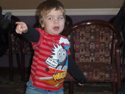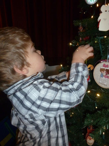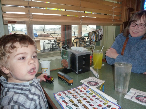 Mommy and I are still staying with Grandma Wynne and Grandpa Al. I put some more ornaments on the tree, and we went out for lunch at the train restaurant and the owner let me blow the train whistle!
