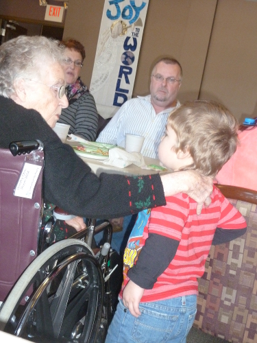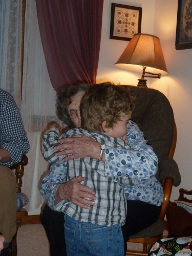 Asking Great-grandma Dorothy if it was time to open presents yet.