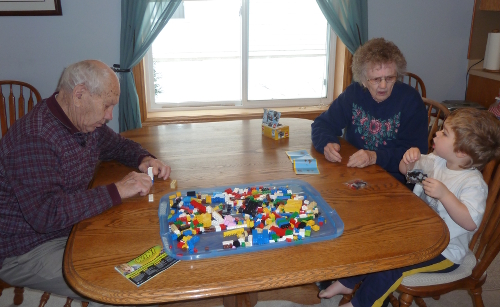 Teaching Great-grandpa and Great-grandma how to play LEGO.