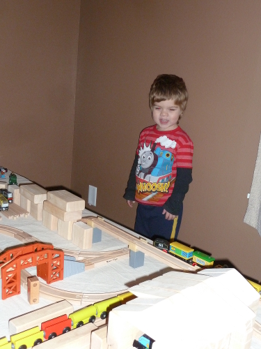 On Sunday Mommy had to study for school, so Daddy and I played all day. We worked on my train tracks and built the Steam Works, Tidmouth Sheds, and the Diesel Works out of my blocks.