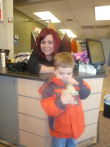 Daddy and I went to stay with Grandma Wynne and Grandpa Al for the weekend so Mommy could do homework in peace, and I got my hair cut by the nice lady in the picture. I didn't like the hair cut so much, but I went to the toy store and got Connor afterward so it was all okay.