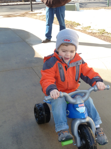 And on Sunday morning we went to see Great-grandma Ohm (again, Daddy forgot to take pictures), and I enjoyed the sunshine and spring temperatures by riding my trike on the driveway - but mostly through the big puddle by the garage.