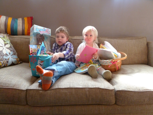 Before lunch we got some Easter presents, and then we went out to find Easter eggs! Then we opened the eggs and I found trains and lots of money!