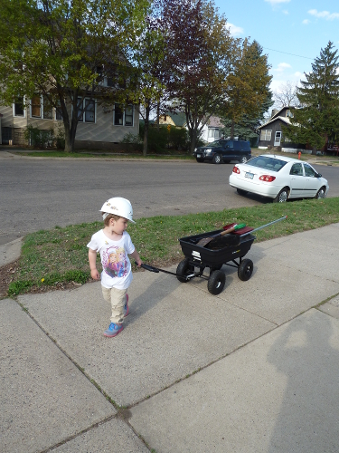 Hauling the dirt and tools.