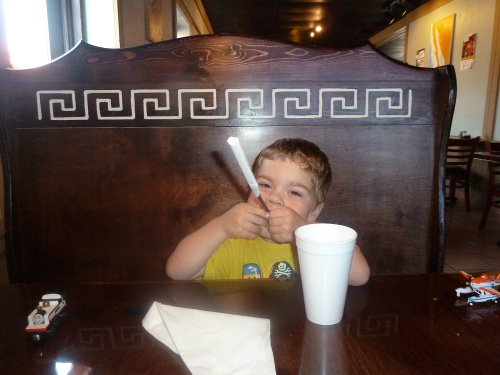 On the way home we stopped for lunch. I drank a lot of water. And Mommy taught me how to make the straw wrapper fly off.