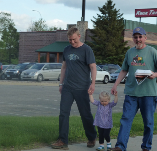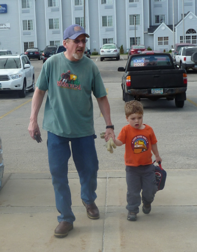 Grandpa Kevin walking back to the hotel with Josh and Freya