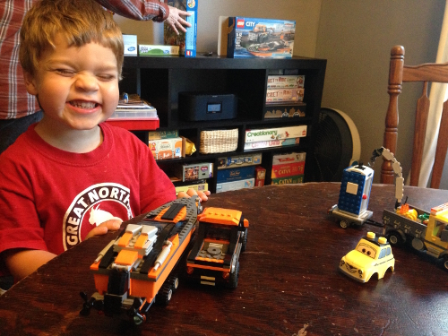 Since Mommy and Daddy needed help, I spent a lot of time with GG, Grandma Wynne, and Grandpa Al since the surgery. Actually, GG and Grandma Wynne spent more time watching me the past week than Daddy did - he was too busy taking care of Mommy. And of course, when my Grandparents are around I get presents. Lots of presents. I got some cool games and crayons and a coloring book, I got some new LEGO sets, and I got a big cement mixer truck from GG! (That is what is in the yellow wrapping paper).