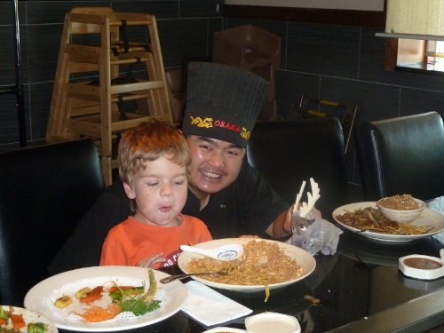 Mommy and I went out for lunch with GG to the place where they make the food right in front of you. The fire was scary but everything else was fun.