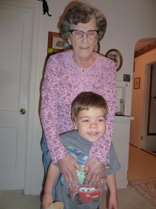 We let Mommy have the weekend off and went visiting. We went to see Great-grandma Darlene at her house. Daddy and Grandpa fixed her sewing machine while I tried to get Max to play with me. Max was more interested in watching television, so I had Great-grandma's toys all to myself. Well, except for when Daddy was trying to play with them, too.