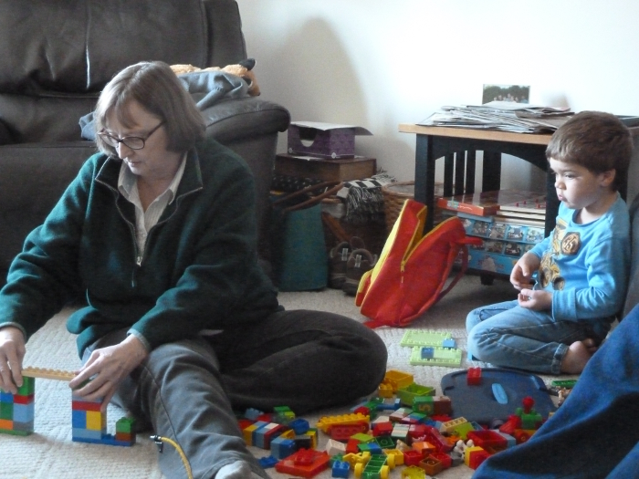 Sunday I spent the day with Grandma Wynne and Grandpa Al. Daddy had some shopping to do, so I watched Space Racers and played with my smoke jumpers and the DUPLO train. Grandma helped do some building and Grandpa found some boxes and boards to make tunnels for the train.