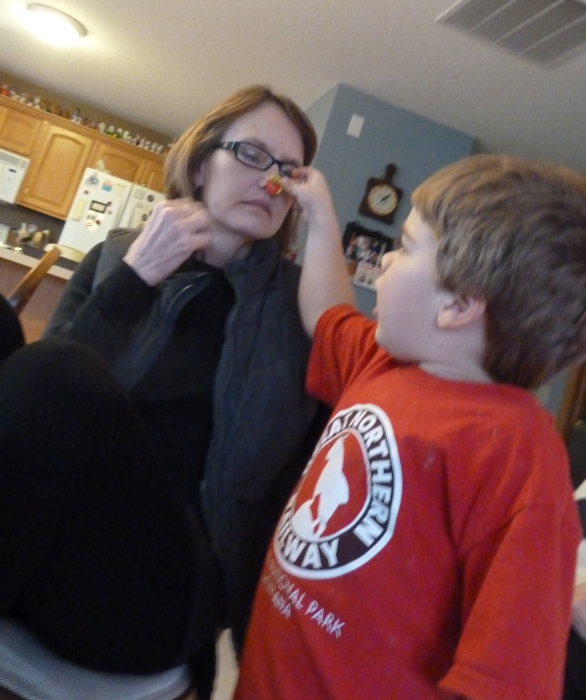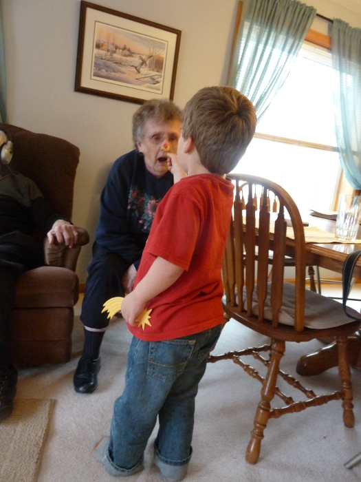 Stickering Great-grandma Muriel's nose.