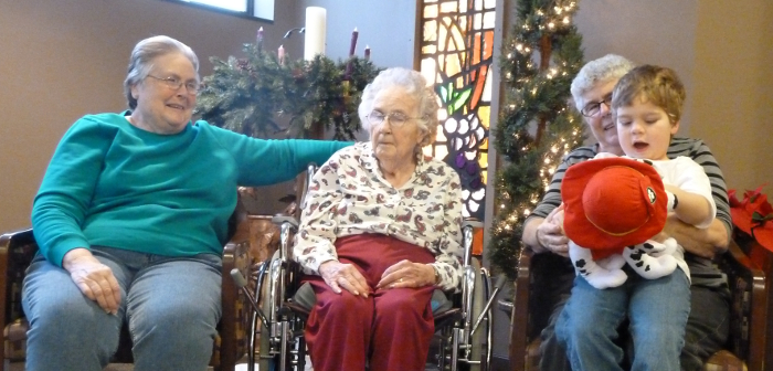 Me with Diane, Great-grandma Dorothy, and Janice - and my new Marshall the Fire Pup toy.