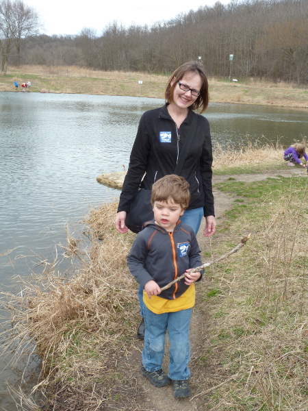 After I was done riding on Sunday, we stopped to see Great-grandma Dorothy for a few minutes on our way to see GG. We went to lunch with GG at Noodles, and then we went to see some fossils at the nature center. There was a T. rex and an Allosaurus. We also walked around the pond, and GG bought me a little T. rex I can take to school.