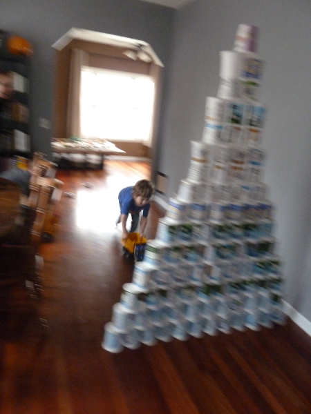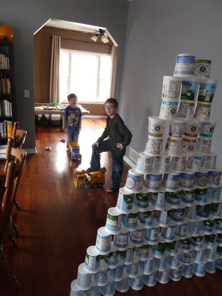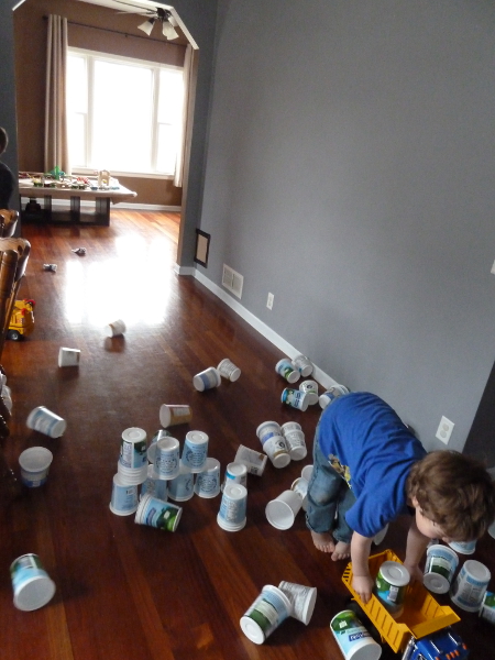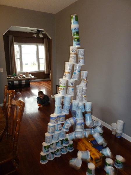 On Tuesday, Sawyer was over for a few hours, since Daddy picked him up from LEGO Club! I want to go to LEGO Club! Sawyer and I played with my LEGO and we built towers out of my yogurt cups.