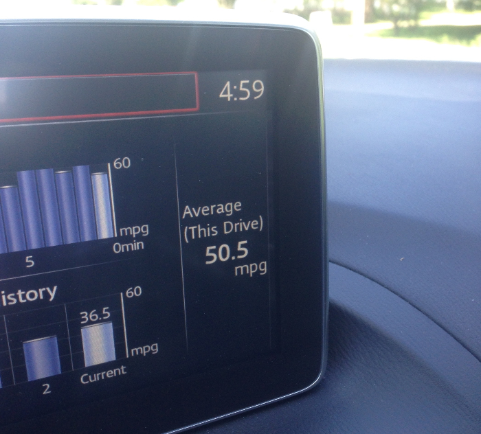 Daddy was very happy on the way home because he managed to get 50 miles per gallon for the trip. So I will humor him and include the picture of the screen he took with his phone camera as evidence.