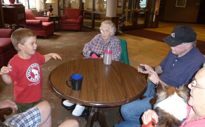 Visiting with Great-grandma Dorothy, Auntie Diane, and Uncles Denny and Milton.