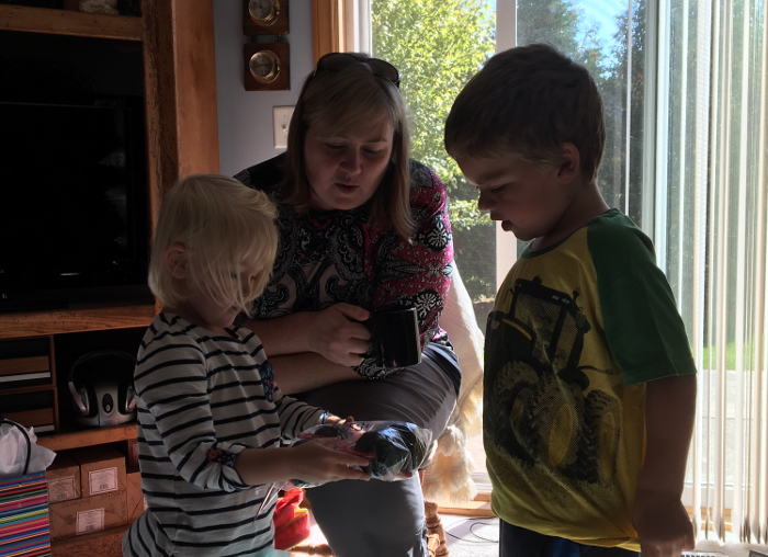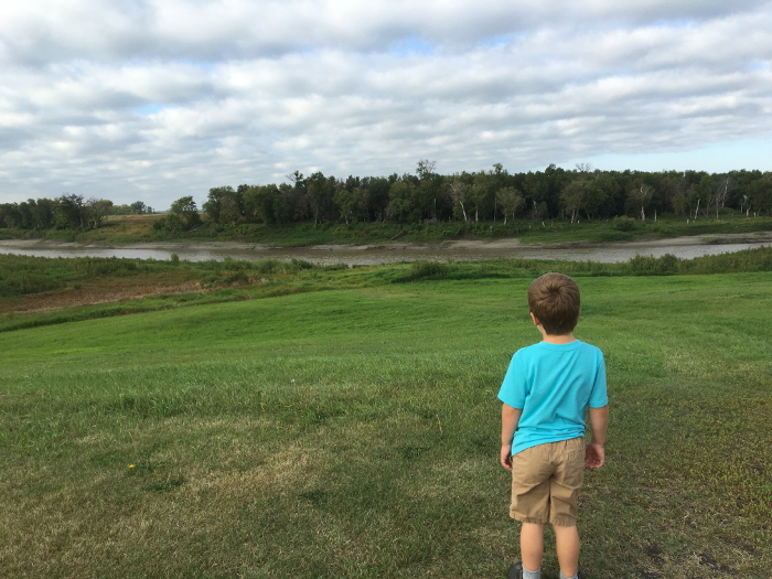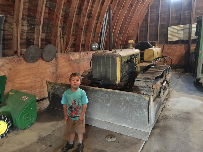 On Monday we went out to the old farm to look at the little bulldozer and the river, then we made the long drive back home. We stopped at Grandma and Grandpa's to return their car, and then we went back to our house with Mommy.