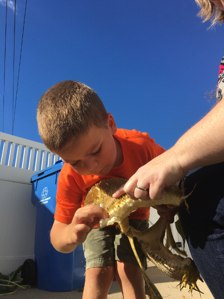 Kara came down Saturday, and she helped us harvest our sunflower seeds! After that we took some more of the garden out to the compost farm.