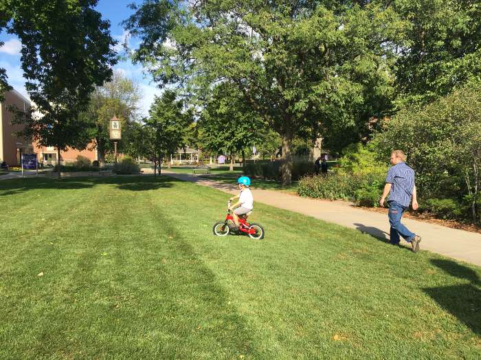 I went to campus with Mommy and my bike, and after a few tries I just did it. I got some bumps and bruises, but I was able to ride almost all the way across campus by the end of the afternoon.