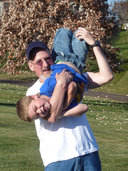 GG and Grandpa Kevin picked me up in the morning and we went for breakfast and spent the day doing fun stuff. We played with robots, we fixed Grandpa Kevin's motorcycle, we watched videos of the volcano Grandpa and GG used to live by, and we chased each other around in the grass.