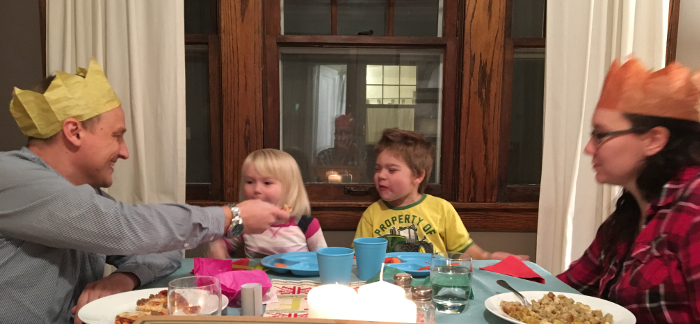 Eating pizza and wearing Christmas hats. Well, Mommy and Josh are.
