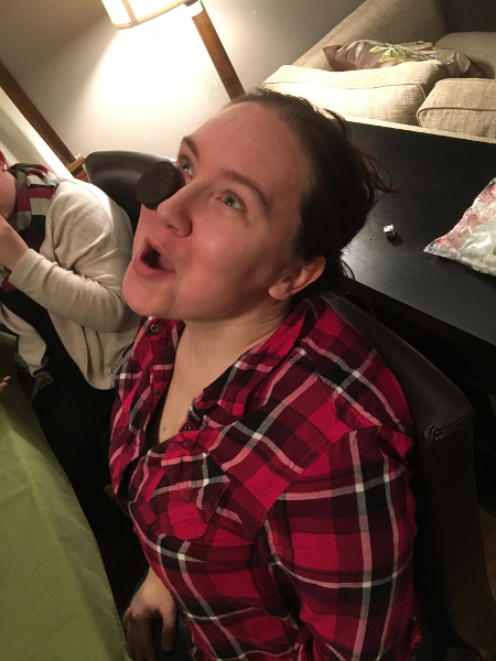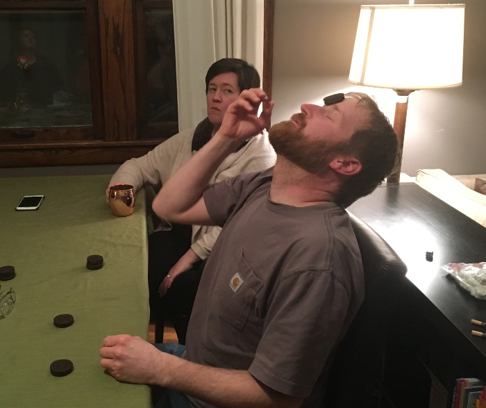 Daddy playing a silly game at Kara and Josh's party. He's supposed to get the cookie in his mouth without using his hands.
