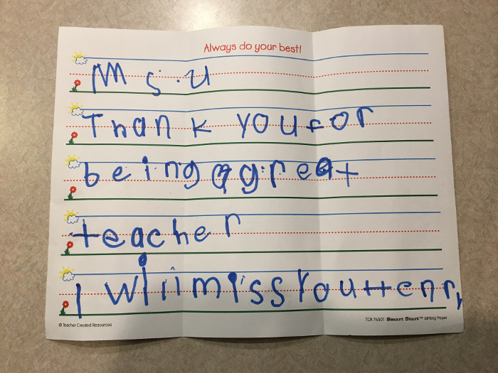 This week was also Ms. U's last week with my class. My regular teacher comes back next week from being home with her new baby. I wrote Ms. U a thank you note.