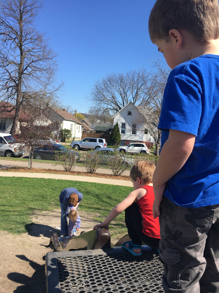 Saturday was a big day. We built a LEGO volcano in the morning, then we went to the Earth Day Celebration/Farmer's Market for a few hours. We were just going to stop for a few minutes, but Mom and Daddy were talking to a lot of people, and there was a bus to play on and a cherry picker to sit in, and music, and a playground. So it was about three hours instead of fifteen minutes. After all that, we ran some errands, then built more LEGO, washed the car (daddy paid me a dollar for helping him because I did such a good job not spraying him with the hose), and then we went to a falafel party and I stayed up really late - we didn't get home until almost 10:00 PM! (No pictures of that, though - we were outside and it was a little too dark for good pictures.)