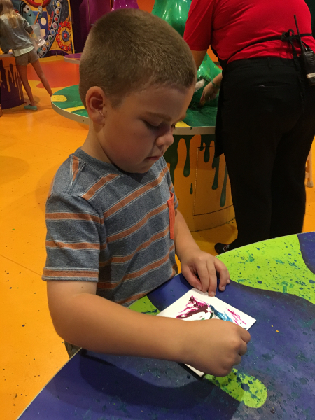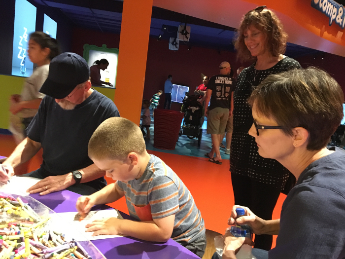 Showing Nancy one of the cool drawing toys they have at the Crayola Experience.
