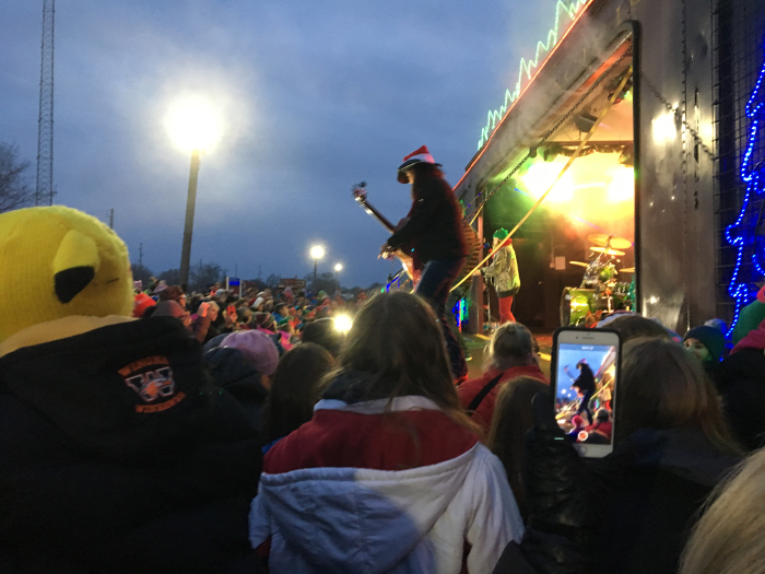 Watching Terri Clark sing from the Holiday Train stage. She wore a Santa Claus cowboy hat.