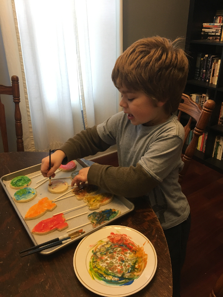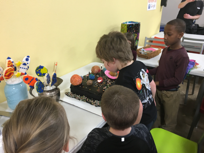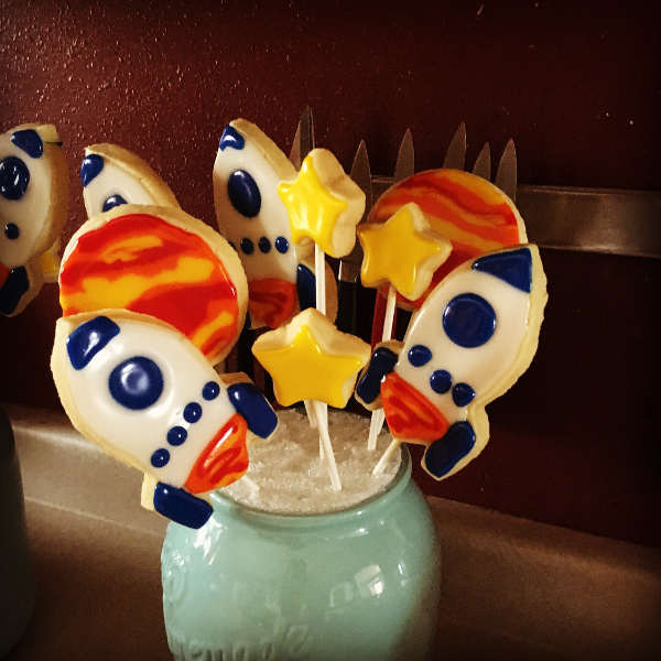 Decorating rocketship and planet cookies.