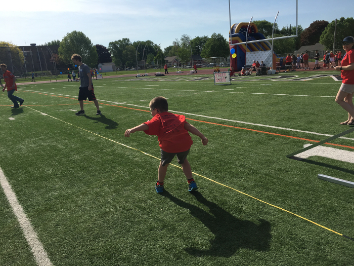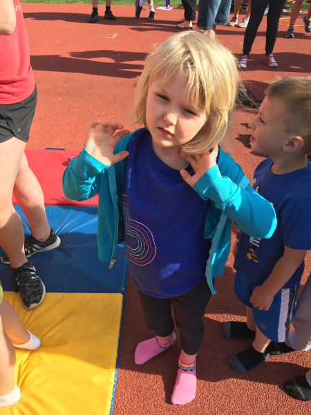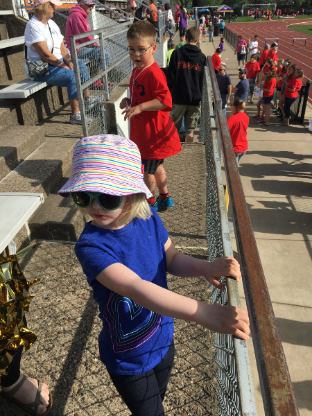 This week's entry is all about the track and field day I did on Friday. I did the softball throw, the soccer kick, the 50 meter dash, and the 400 meter relay. GG, Grandpa Al, Grandma Wynne, Auntie Kara, Auntie Diane, and Freya all came to watch. Mom and Dad were there, too. It was much nicer than last year, which was cold and gray and windy. I took third place in both of my races and I got a medal for throwing and kicking. It was a lot of fun!