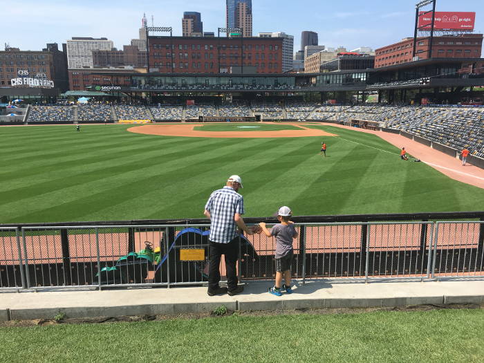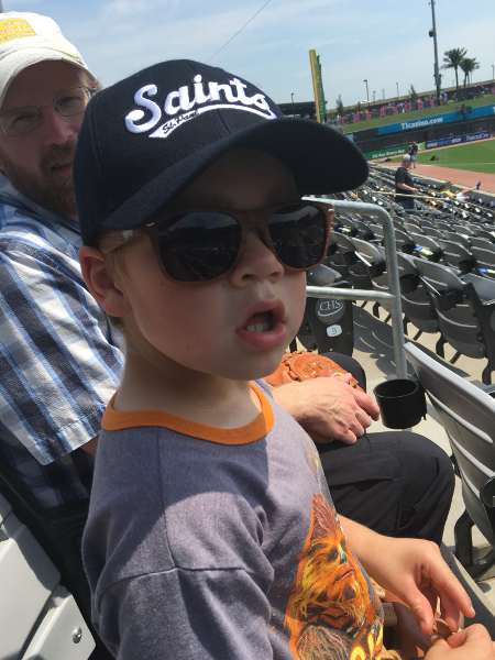 On Wednesday, we went to a baseball game for Mommy's birthday. It was really hot. We hid in the shade as much as we could, and Mommy and I watched the second half of the game from behind home plate, hidden from the sun. Daddy was close to getting a foul ball twice, but they landed next to other people who were able to grab them first. We ate a lot of expensive food, got sunburned, and had a good time. The Saints won, 10-3.