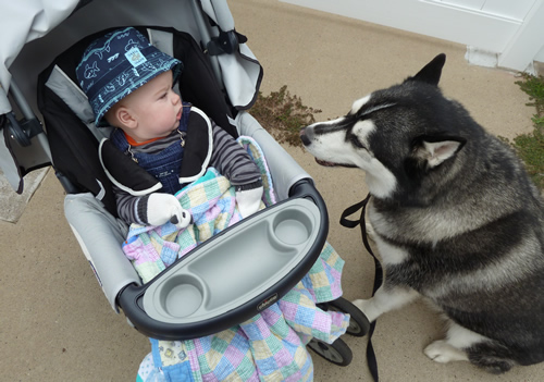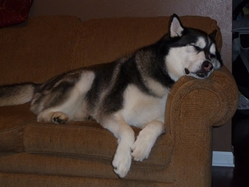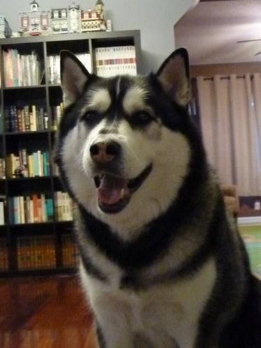 And Duke loved to walk. Well, really he just loved to sniff everything in the neighborhood - maybe it wasn't walking he loved. He might have been just as happy if we had fetched every tree and bush and post in a three-mile radius and held them to his nose for inspection, one-by-one. However, neither snow nor rain nor heat nor gloom of night (or early morning, for that matter) could keep him from his daily rounds. We could not say the word walk in his presence, so we spelled it - and eventually he seemed to learn how to spell just that one word. When someone said "walk," his ears would straighten up and rotate toward whomever said it. And then he would be right there, his front paws tapping on the ground in excitement, bumping into things and people, dancing toward the door. And if the walk didn't start fast enough? He would voice his displeasure and impatience with a deep trilling howl crossed with a growl - one of the best noises made by anyone or anything.