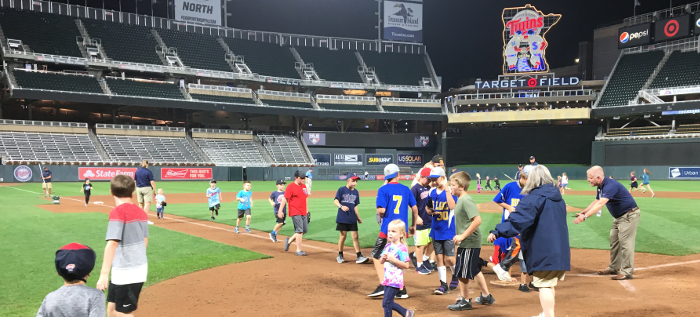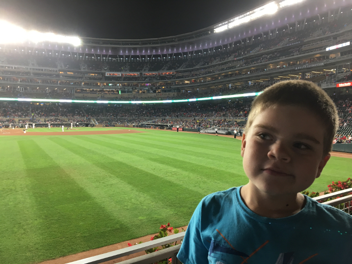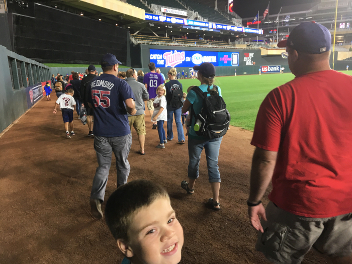 Monday we started out playing Mille Bornes, a car racing card game. Then we went to the Zoo and watched a movie about pandas - it was my first IMAX and first 3D movie. We also went to the bird show. After all that we went back to the house for a bit before Daddy and I took the train downtown to the baseball stadium to see a game. It was my first major league game - too bad the Twins lost. And then I got to run the bases after the game! It was awesome. Daddy was jealous - they wouldn't let any of the adults on the grass. We didn't get back to the house until 11:00 PM.