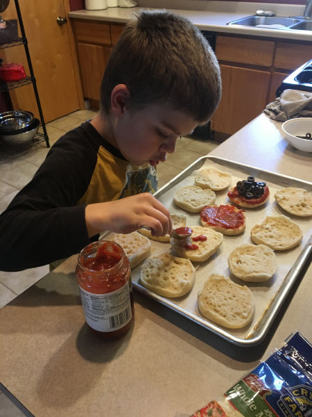 Making English muffin pizzas for New Year's Day!