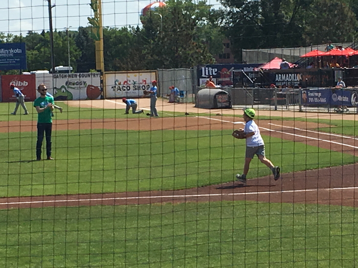 Right after we walked into the stadium, a lady asked if I wanted to be part of the on-field activities. I said, "yes." Turns out my job was to bring out the baseballs for the first pitches.