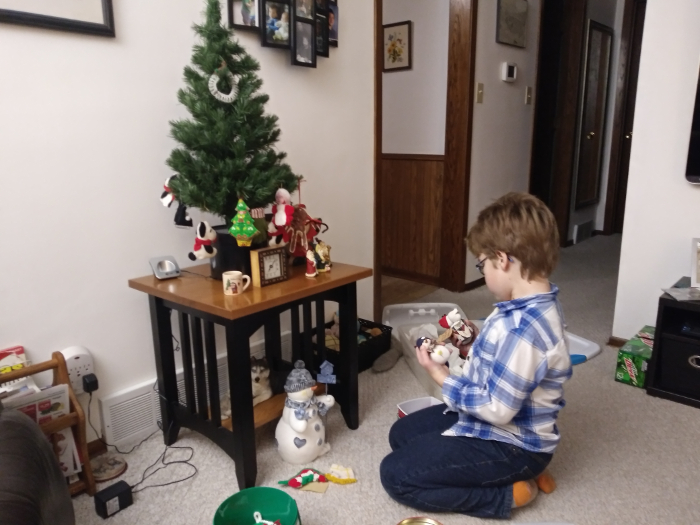 Helping put up the Christmas tree. We didn't have room for one at our house this year with all of the baking going on.