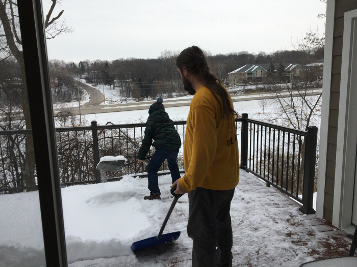 Saturday we went back again. We set up my room in the basement with all of my toys, and Dad and Grandpa cleaned out the storage unit, I helped Neil shovel off the deck (Dad finally took some pictures), and I played with Loki. We left earlier than the other two days because we were tired and some ice and snow were headed our way.