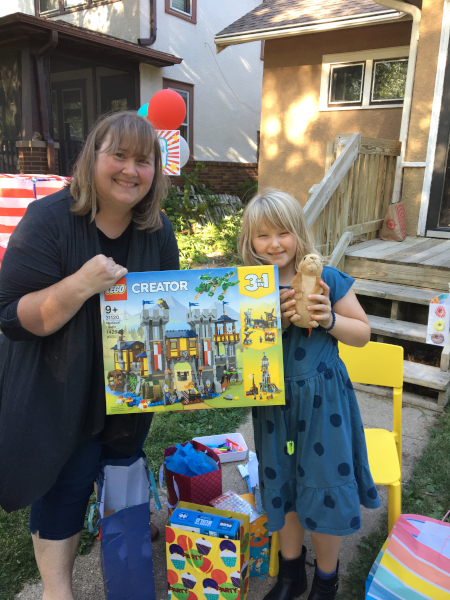 Freya with Kara and her new LEGO set from us.