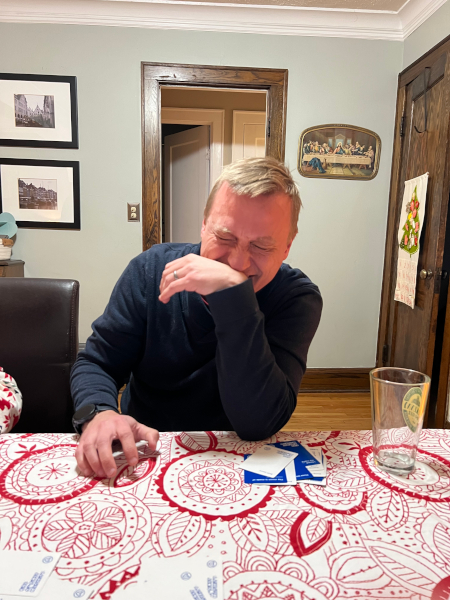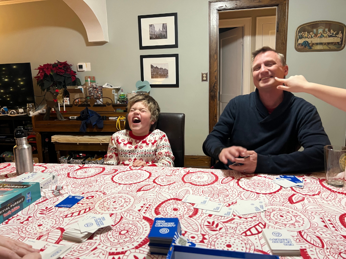 After the Christmas party we went back to Freya's and played some games. We played Trivial Pursuit and Kids Against Maturity. We were laughing so hard that Josh cried and Mommy thought she was going to pass out because she couldn't breathe. After Freya and I went to bed, Mommy talked Dad into playing a game he had never heard of before (and he was terrible at it).