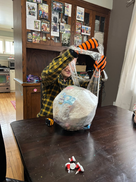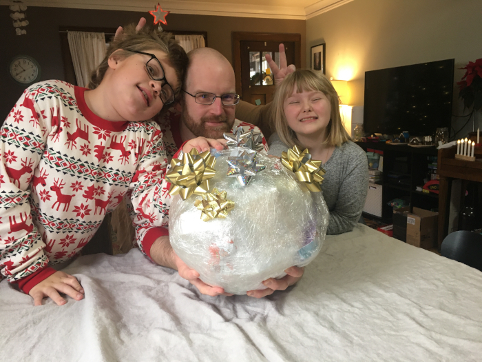 Having an indoor "snowball" fight with the wrapping from the prize ball.