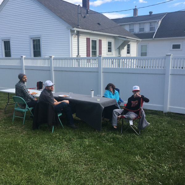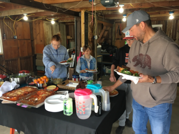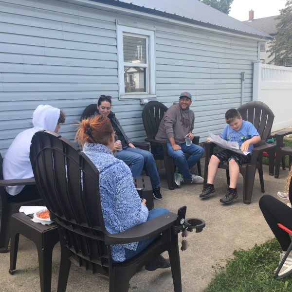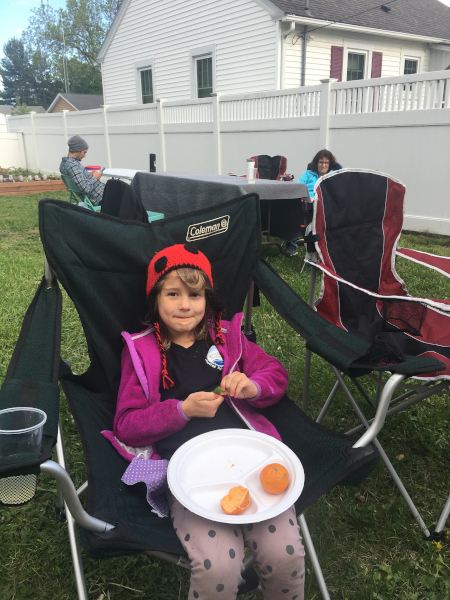 Sunday we had some people over: Sawyer and Angie; Megan, Josh, Lucie, and Clara; Tabitha, Dustin, Addie, and Aiden. We played basketball and bean bag toss and ate outside, even though it was a little chilly. Mom made ravioli bake and garlic bread, almond cake, and brownies. Other people brought things to share.