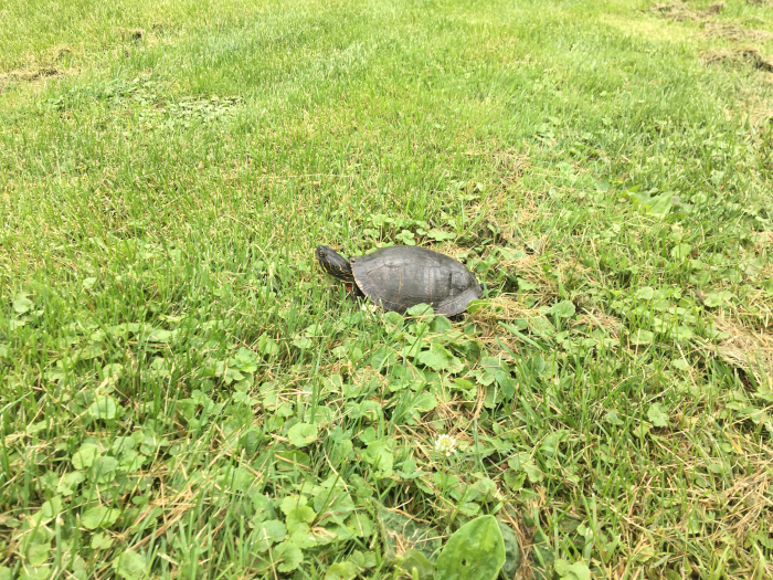 Not a ninja turtle. He was walking back to the lake after making a dangerous side trip onto the street.