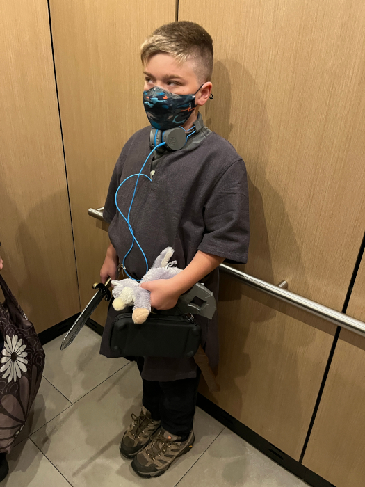 In the elevator at the hotel - a modern Viking with a Switch and some waterproof hiking shoes.